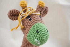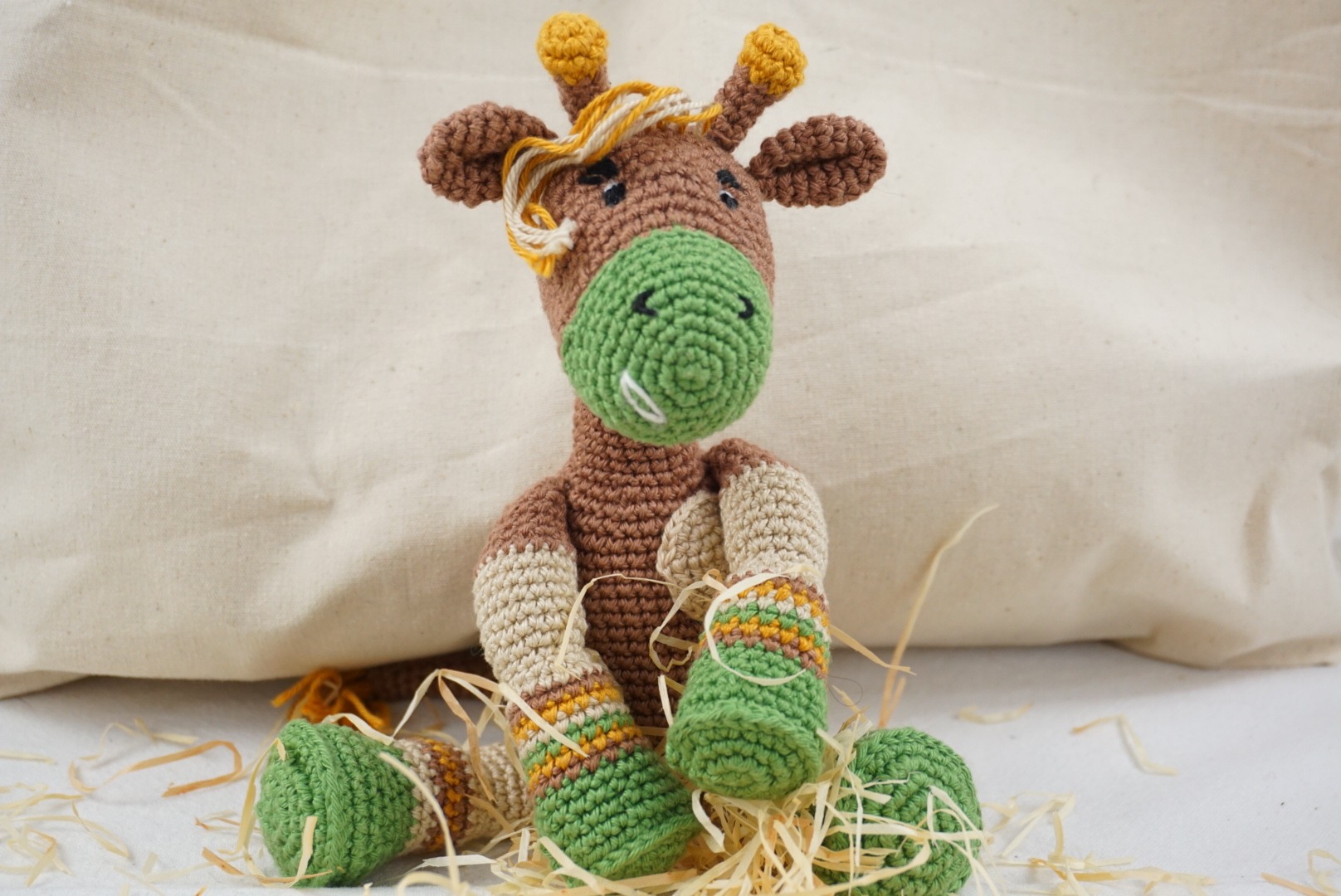 Yeux brodés et crinière fixée dans la tête. Pas de petites pièces collées – tout est cousu.